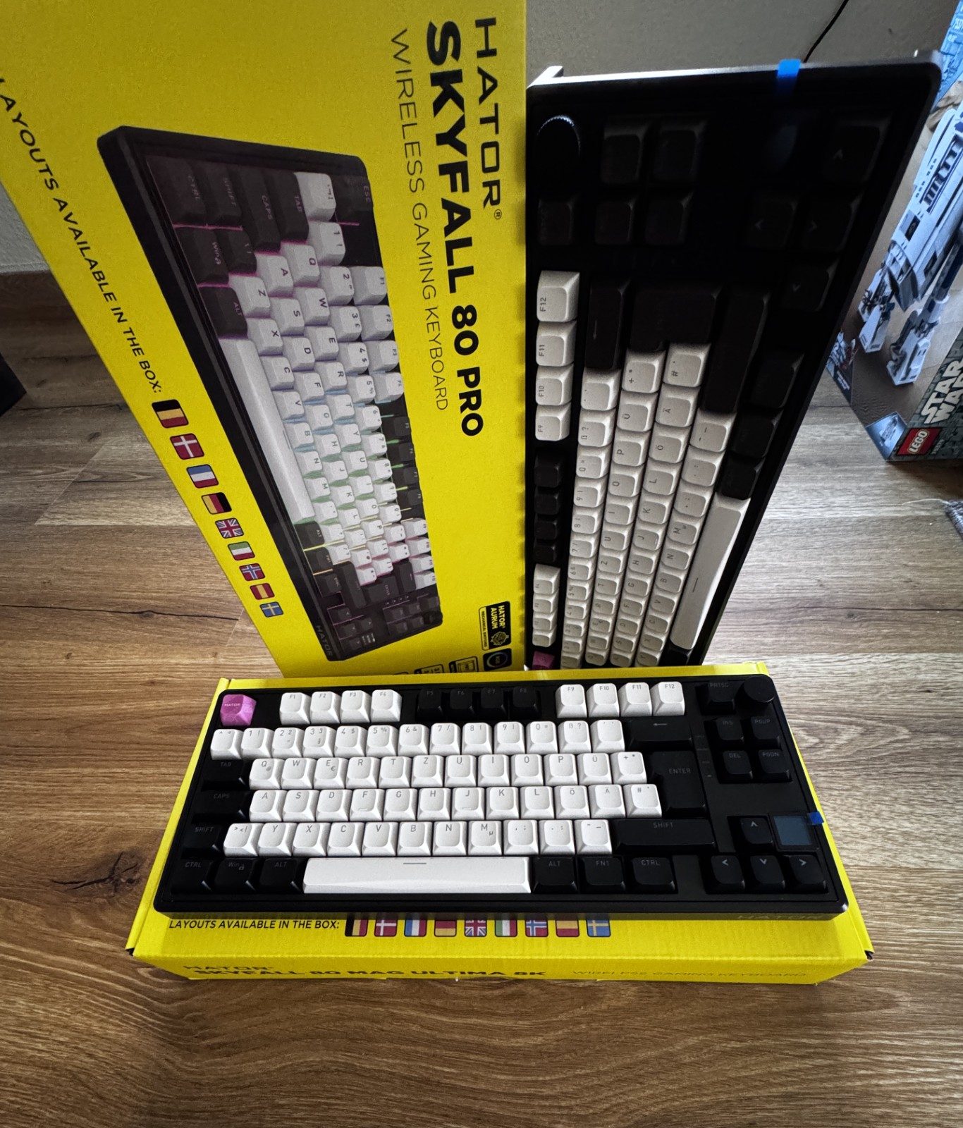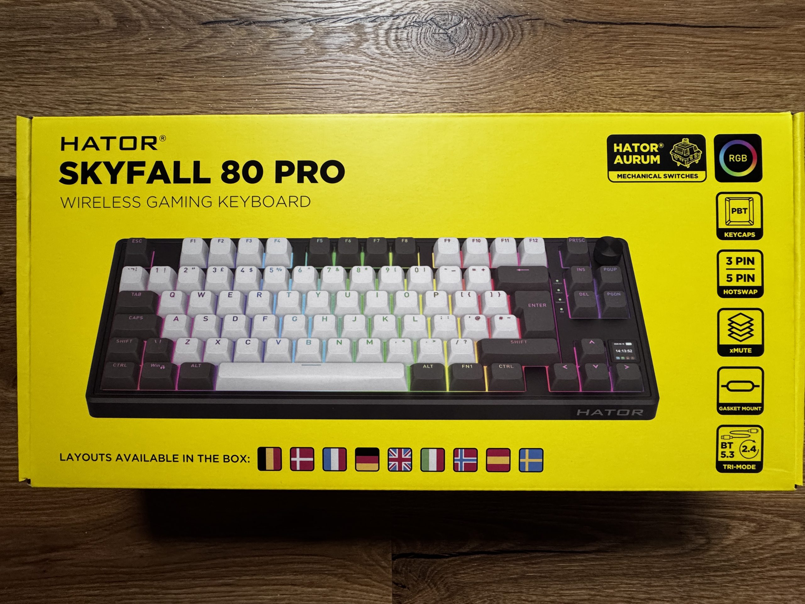 The Skyfall 80 Pro looks almost identical, but uses conventional mechanical Hator Aurum switches and offers hot-swap support for 3- and 5-pin switches. Features such as PBT keycaps, quiet damping, gasket-mount construction and tri-mode connectivity are also listed here.