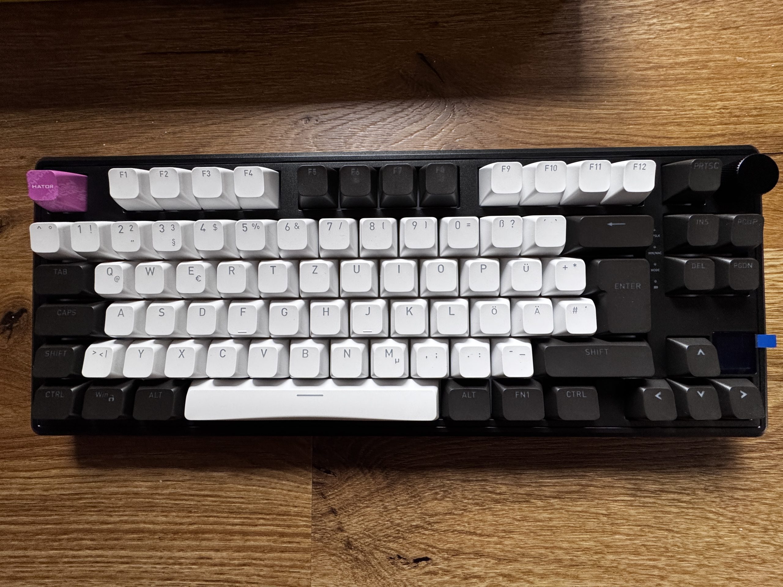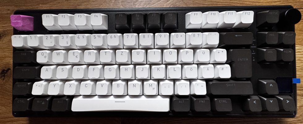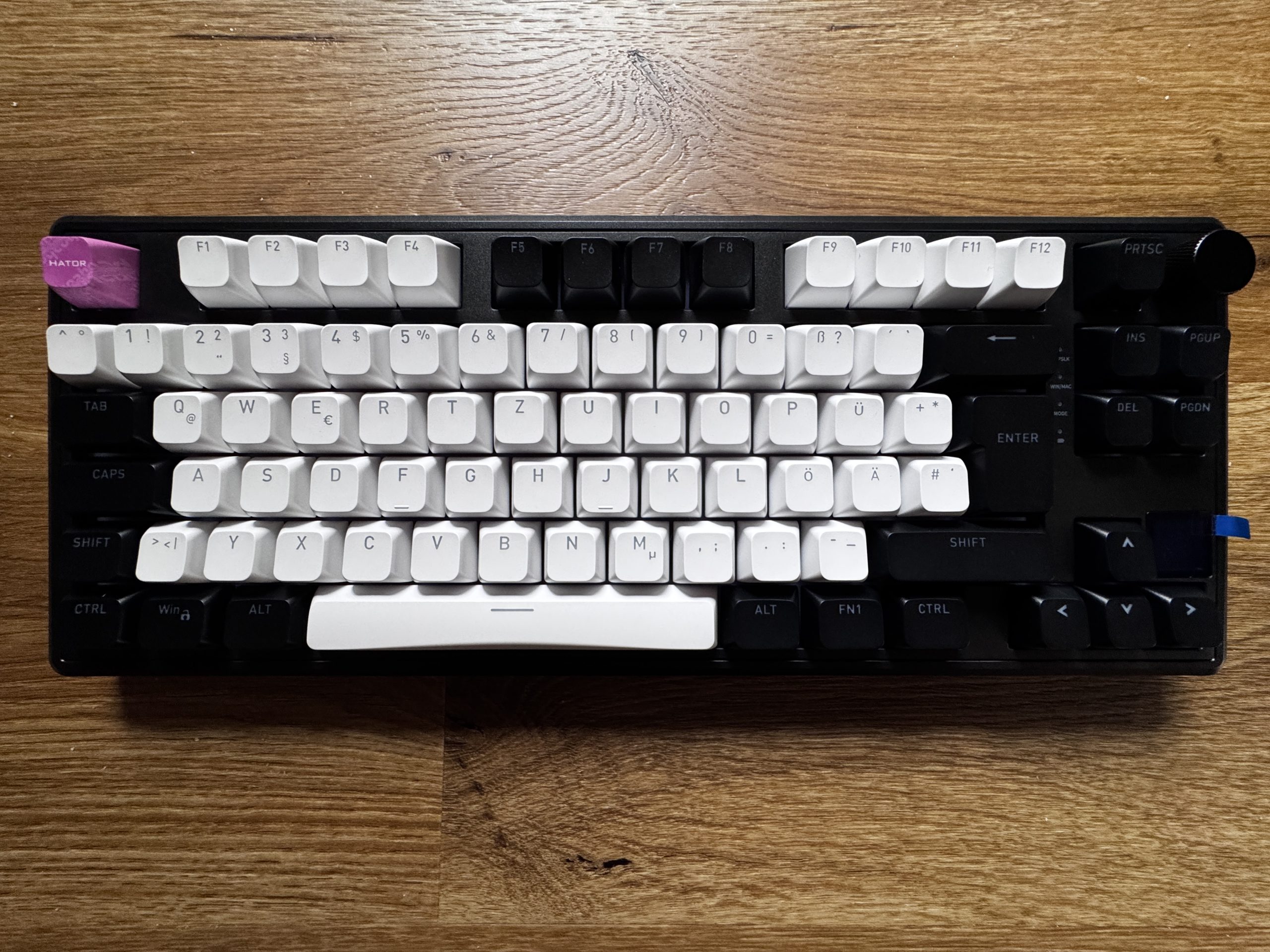 On the top, the compact 80 percent layout presents itself in a high-contrast black and white design. The rotary control at the top right is used for volume and media control, while the evenly arranged buttons leave a tidy and high-quality overall impression. The board has a robust, modern look and is clearly designed for functionality and convenience.