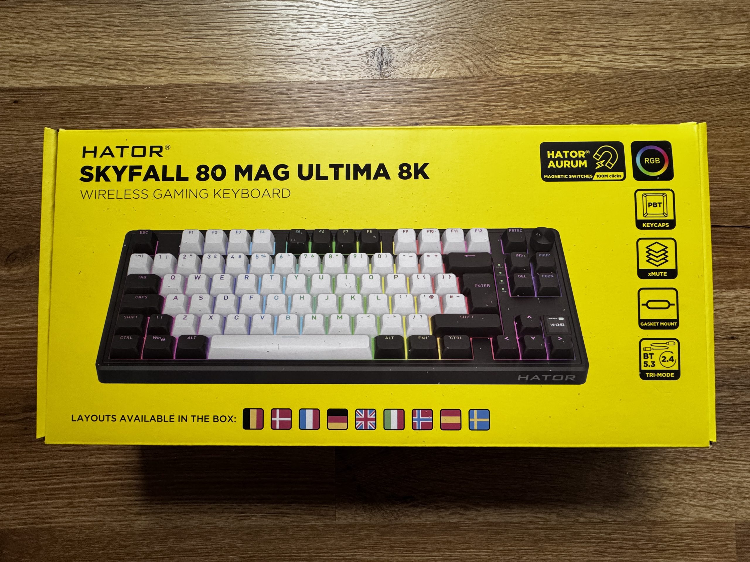 The Skyfall 80 MAG Ultima 8K is equipped with magnetic Hator Aurum switches and supports a sampling rate of up to 8000 Hz. The most important features are shown on the right-hand side of the packaging: PBT keycaps, gasket-mount construction, Bluetooth 5.3, 2.4 GHz and USB-C connectivity, and RGB lighting.