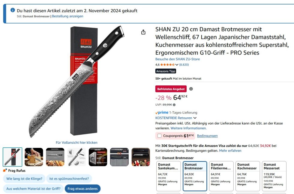 And finally, there is the very human motivation: these knives are not bad at all. On the contrary, they have performed amazingly well for over a year and are significantly better in practice than the previous household knives from WMF or Zwilling, which were at a similar price level. Sharpness, service life and ergonomics are perfectly fine. If it weren’t for the insistent, objectively false claim of “genuine Damascus steel”, I would almost have recommended them.