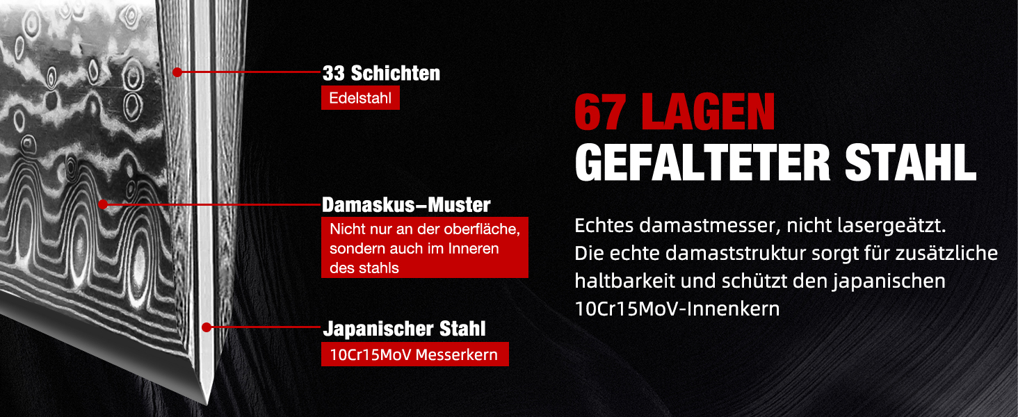 Only the part about the “real damascus” gave me pause right from the start. Even the advertising texts on Amazon seemed too full-bodied: “Forged with 67 layers”, “not laser-etched”, “genuine damask structure through multiple folding and forging”. In addition, photos showing exactly the classic pattern that is more familiar from Japanese one-off products in the price range above 300 euros. And this is where the doubts begin: how can a knife that is supposedly produced using an elaborate multi-layer forging technique be sold at the price of an inexpensive series blade when the material alone for a genuine damascus set costs several times as much?