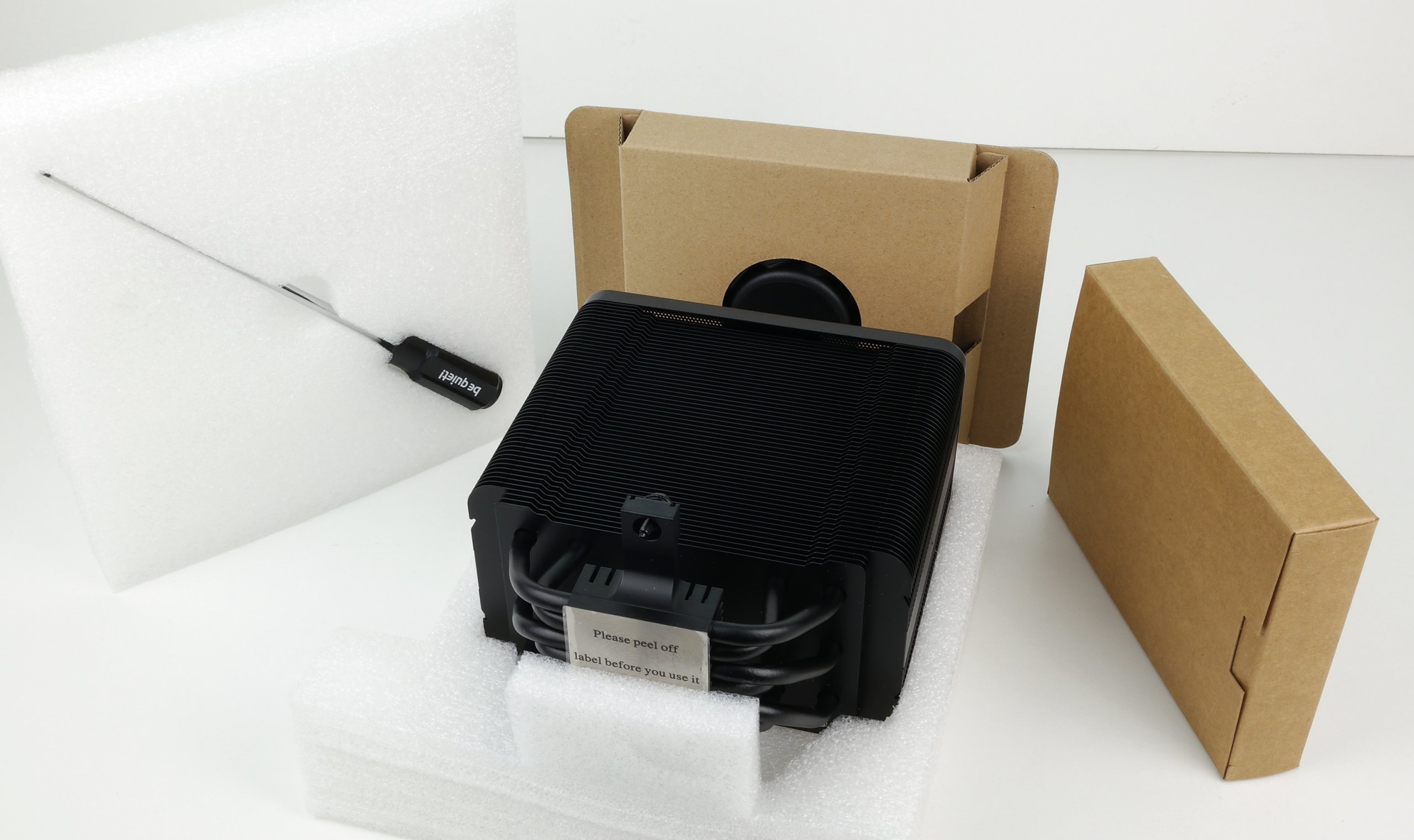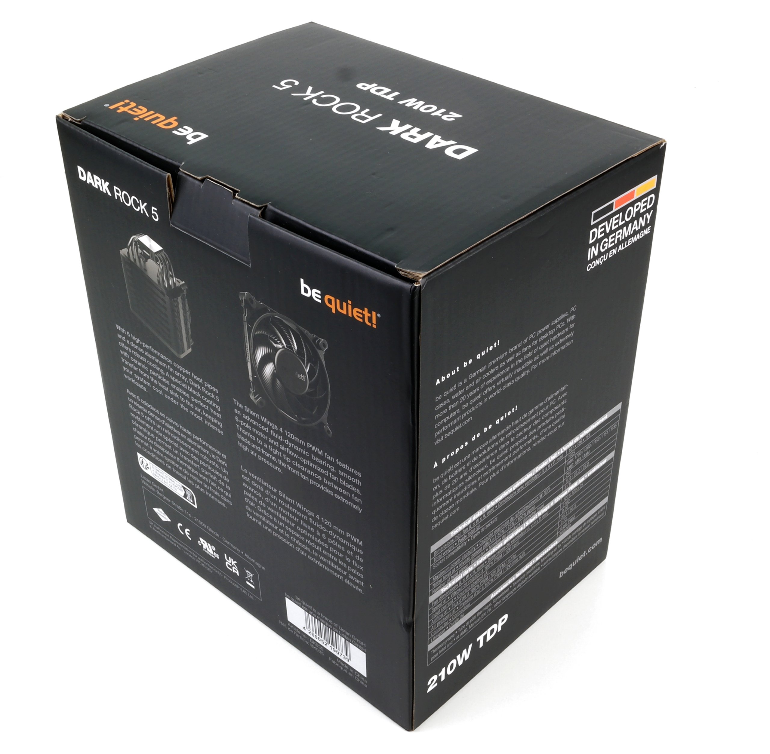 The box of the Be Quiet! Dark Rock 5 has a classic, discreet design in black with high-quality printed elements. The cooler itself, the fan and central features such as “Silent Wings 4” and the high cooling capacity are prominently displayed on the front. The rear and side panels provide detailed information on technical data, compatibility with CPU sockets and special features such as the magnetic top cover or the ceramic particle coating.